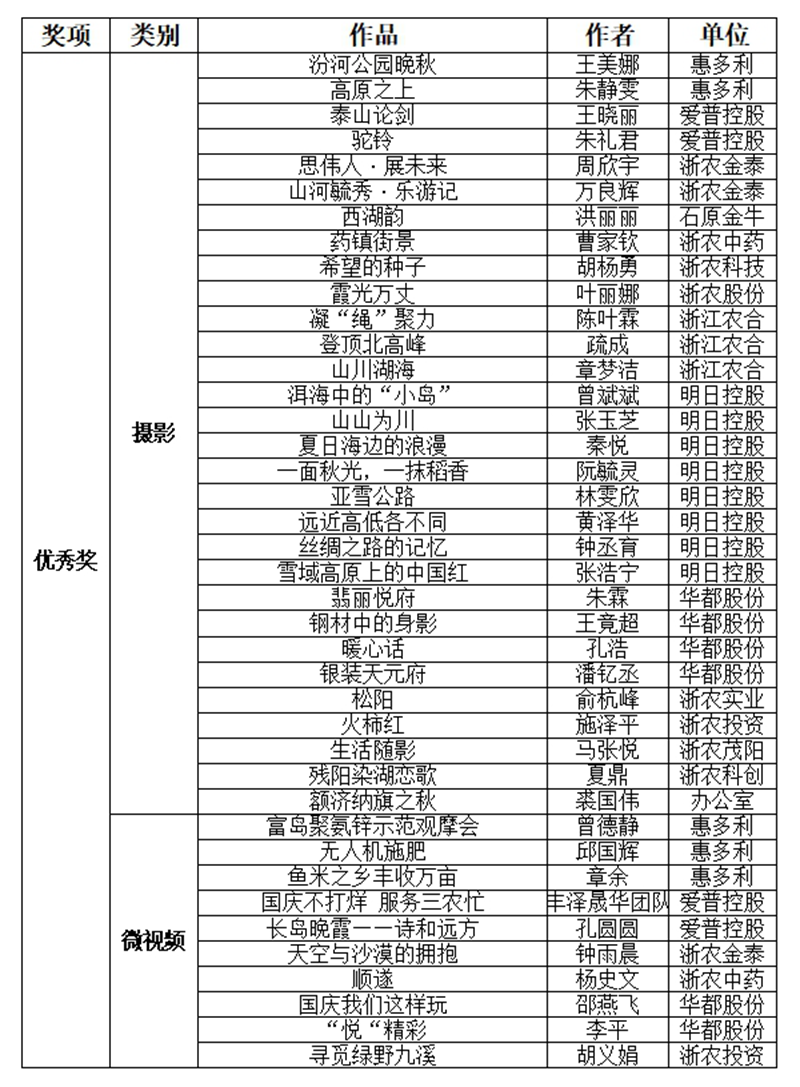 經(jīng)集團(tuán)內(nèi)外評(píng)委評(píng)議,明日控股崔志浩的單幅作品《古代和現(xiàn)代的碰撞》、明日控股邱旸歆的組照作品《山河遠(yuǎn)闊 國泰民安》、浙農(nóng)科技符銀川的組照作品《沃野金麥繪豐圖:農(nóng)業(yè)夢之卷》獲攝影組一等獎(jiǎng),明日控股俞濤《滄海一粟》等6件作品獲二等獎(jiǎng),惠多利韋揚(yáng)《晚秋》等9件作品獲三等獎(jiǎng);浙農(nóng)農(nóng)業(yè)甘良的作品《慶祝祖國母親生日快樂!》獲微視頻組一等獎(jiǎng),浙農(nóng)股份申琪婧《浙農(nóng)青年采菊活動(dòng)》、明日控股俞燁敏《最美風(fēng)景》獲二等獎(jiǎng),金誠汽車陳練翠《信仰的顏色是紅色》、華通商貿(mào)陸嘉琦《山不見我,我自去見山》、明日控股蔡佳楠《山清水秀-大洋塢水庫》等3件作品獲三等獎(jiǎng)。