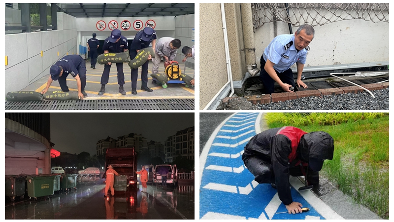 集團旗下華都股份、浙農實業等物業團隊提前部署,展開防汛演練與消防檢查,提前疏浚下水管道,裝填、儲備防汛沙袋。連日大雨下,物業團隊24小時值班,重點針對地下車庫、電車充電區等進行巡檢,堆壘沙袋、及時清掃積水、為裸露在外的電瓶車加蓋防雨布……用貼心舉措守護業主們的溫馨家園。
