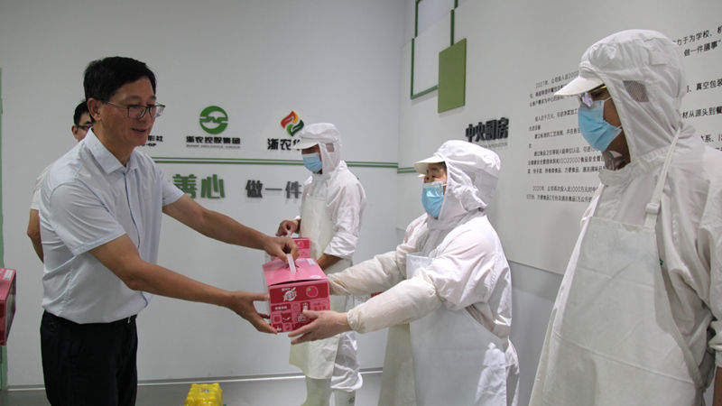 在浙農華盛期間,曹勇奇還聽取了公司經濟指標、重點項目和重點工作完成情況匯報,并深入配送場地、中央廚房以及相關部門,看望慰問奮戰(zhàn)在高溫一線的干部職工,為他們送上防暑降溫用品。
